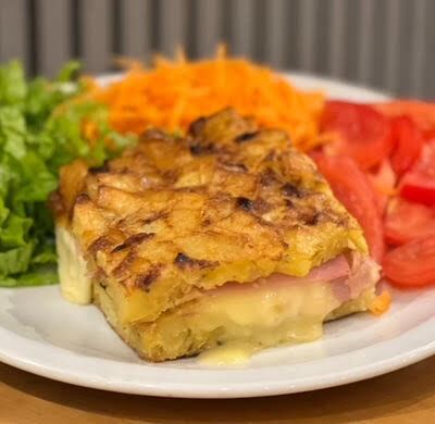 Tortilla de papas rellena de jamon y queso con ensalada de rúcula, tomate t zanahoria .-